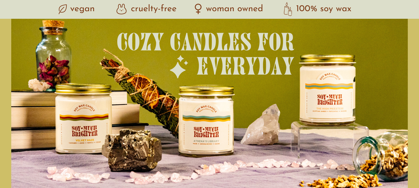 Soy Much Brighter candles are made with 100% soy wax that's made right here in the US. The candles are scented with a fragrance + essential oil blend that's phthalate-free. All ingredients used are vegan, cruelty-free and as sustainable as possible. Check out our sustainability promise at the bottom of the home page to learn more!